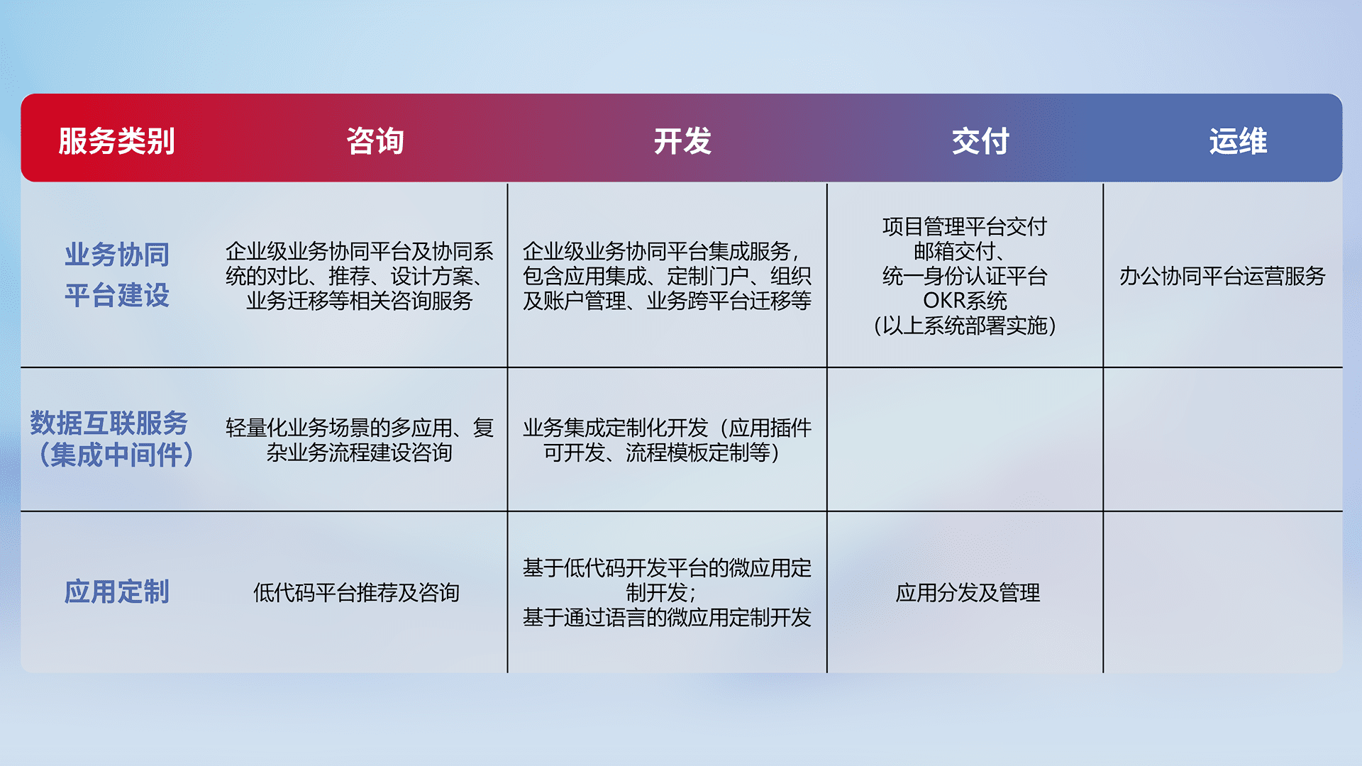 针对钉钉、、、、企微、、、、IDaas等平台级产品提供产品的规划、、、、方案、、交付、、定制化开发等服务,,,实现如统一协同办公、、、、智能客户服务、、、、混合会议管理、、智能数据查询、、、、等业务场景,,,,实现数字化转型。。。。